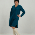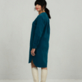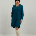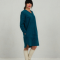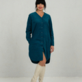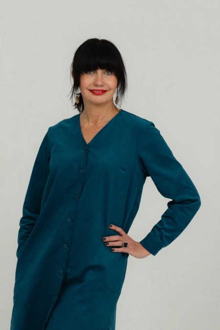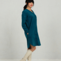 Loose-fit shirtdress made from thin velvet fabric with fine stripes. The dress can be worn with or without a belt. The dress has two comfortable side pockets and buttoned cuffs at the sleeves.