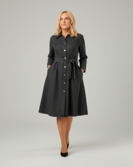 Volditud seelikuosaga kleit “Kai”, 3/4 pikkuses sirged varrukad, šotiruuduline hall