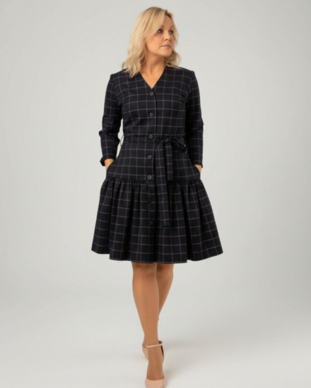 Volditud seelikuosaga kleit “Kai”, 3/4 pikkuses sirged varrukad, šotiruuduline hall