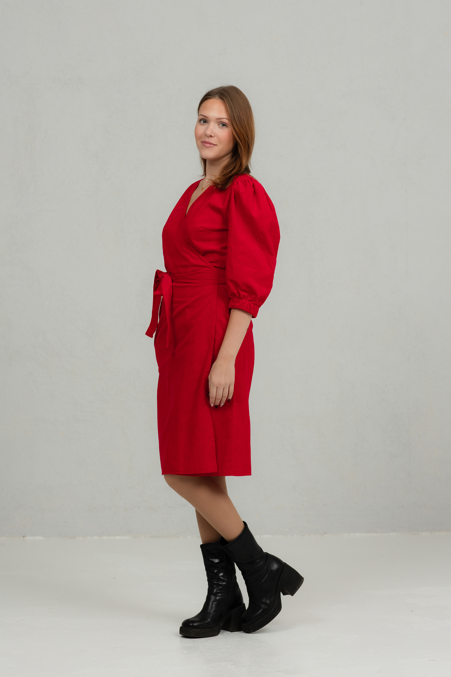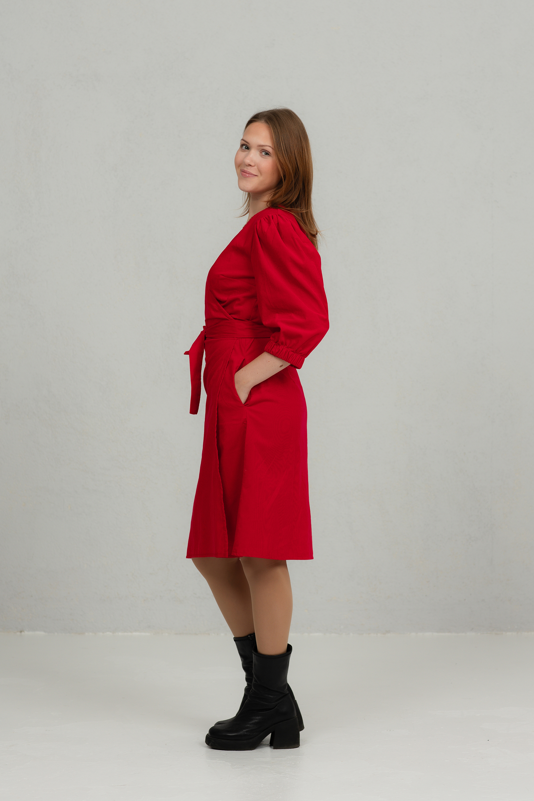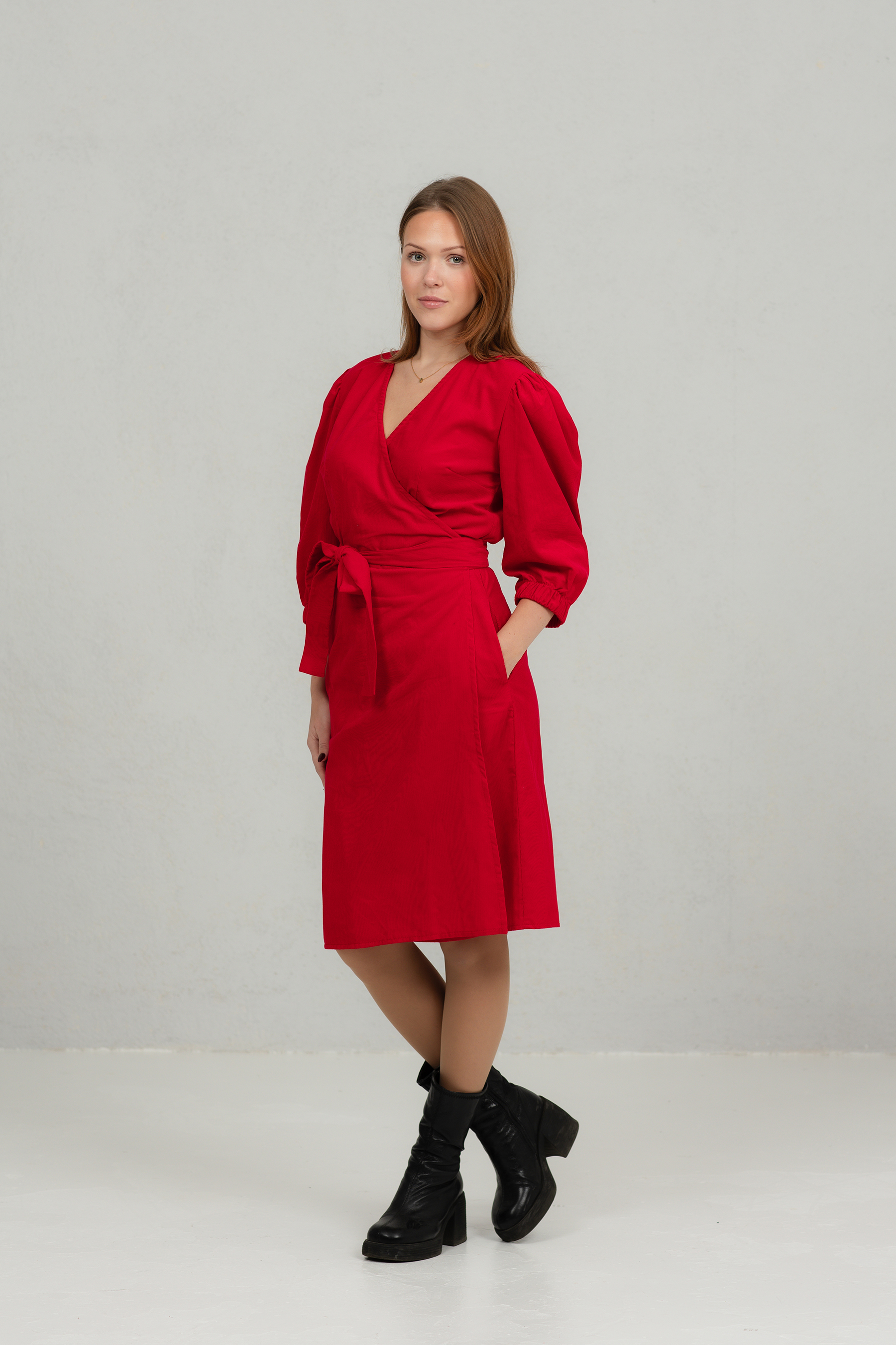 Klassikalise lõikega õhukesest peenetriibulisest velvetkangast hõlmikkleit. Kleit on vööga kinniseotav, nööpideta. Kleidil on 2/3 pikkuses puhvis varrukad ja kaks mugavat küljetaskut.