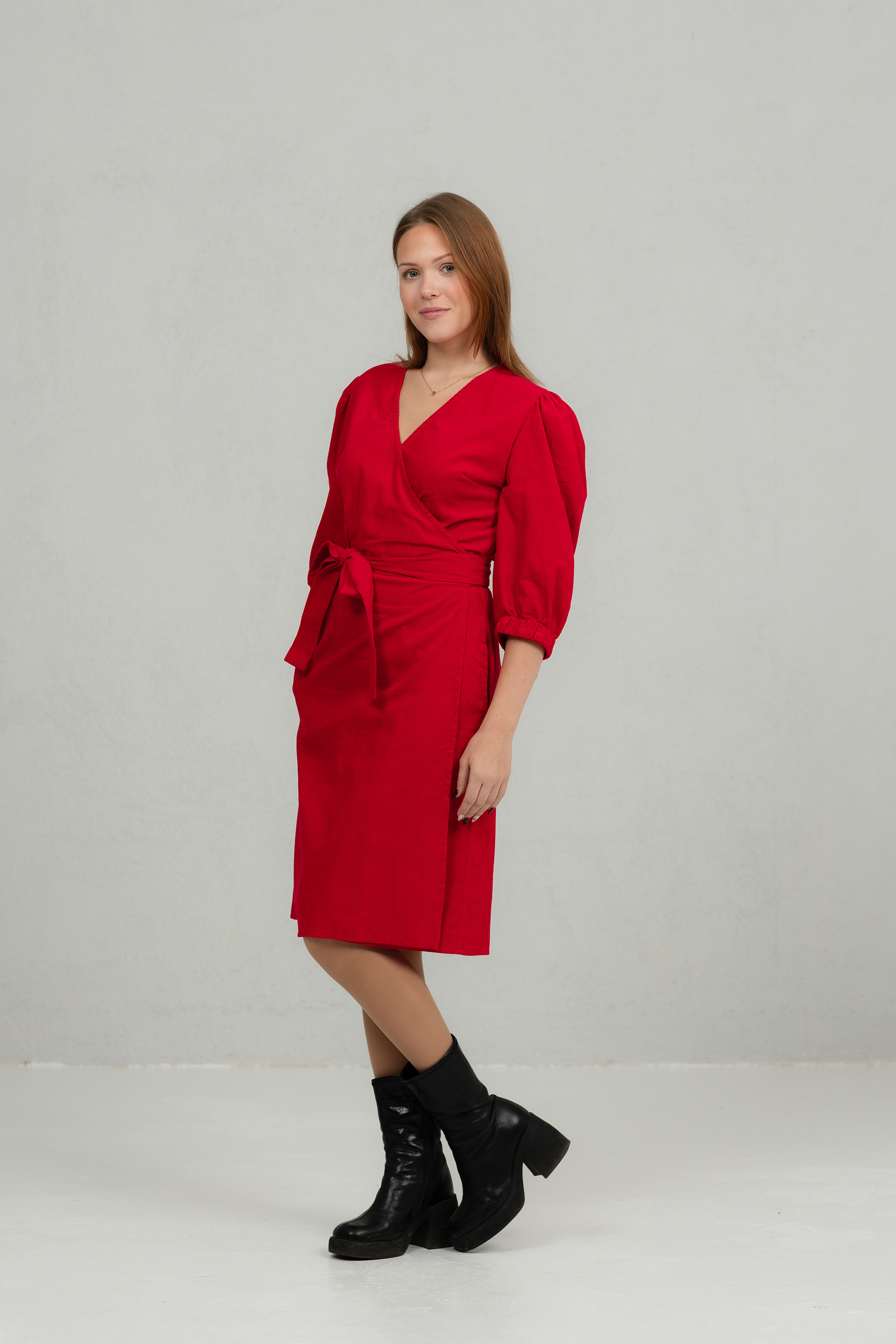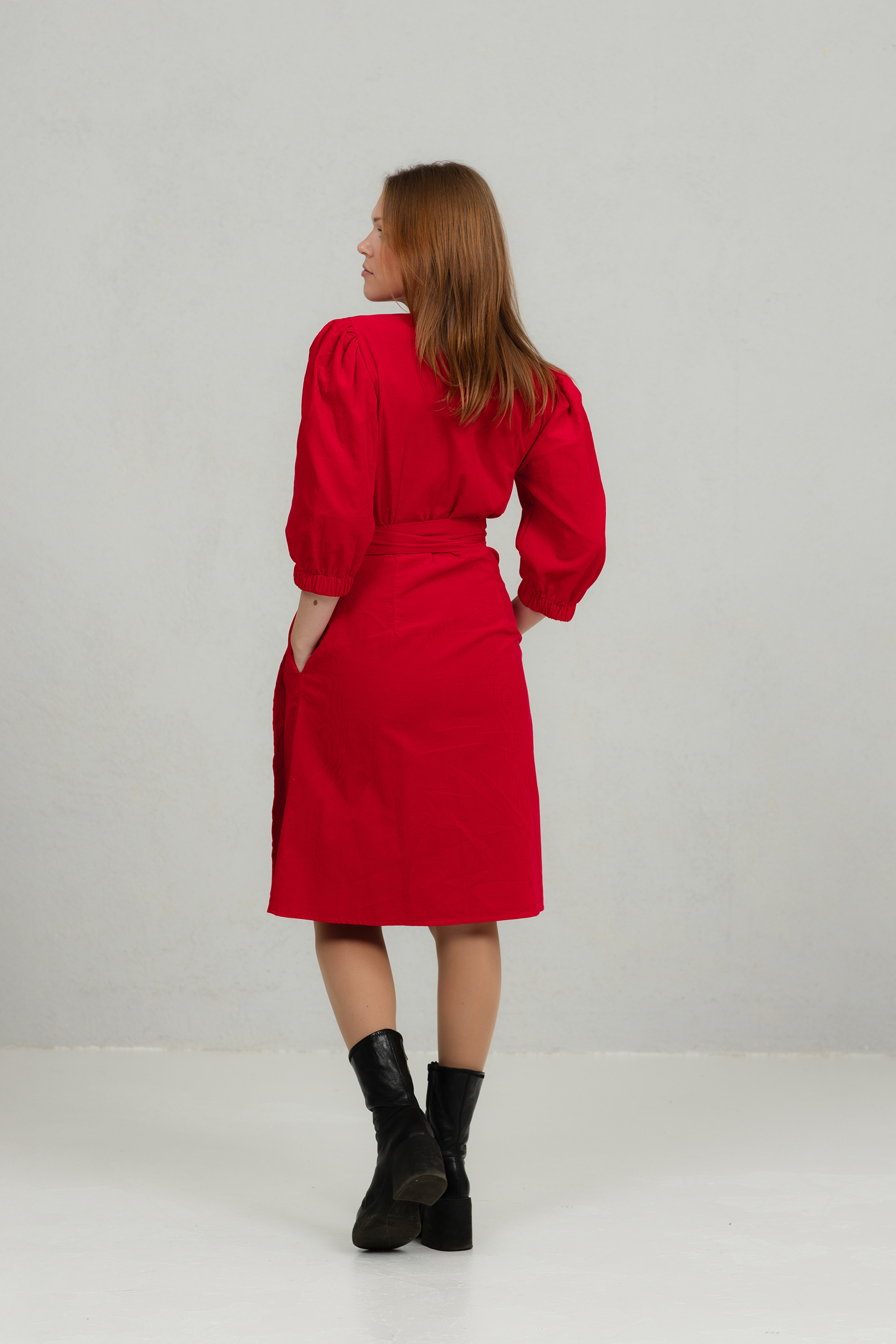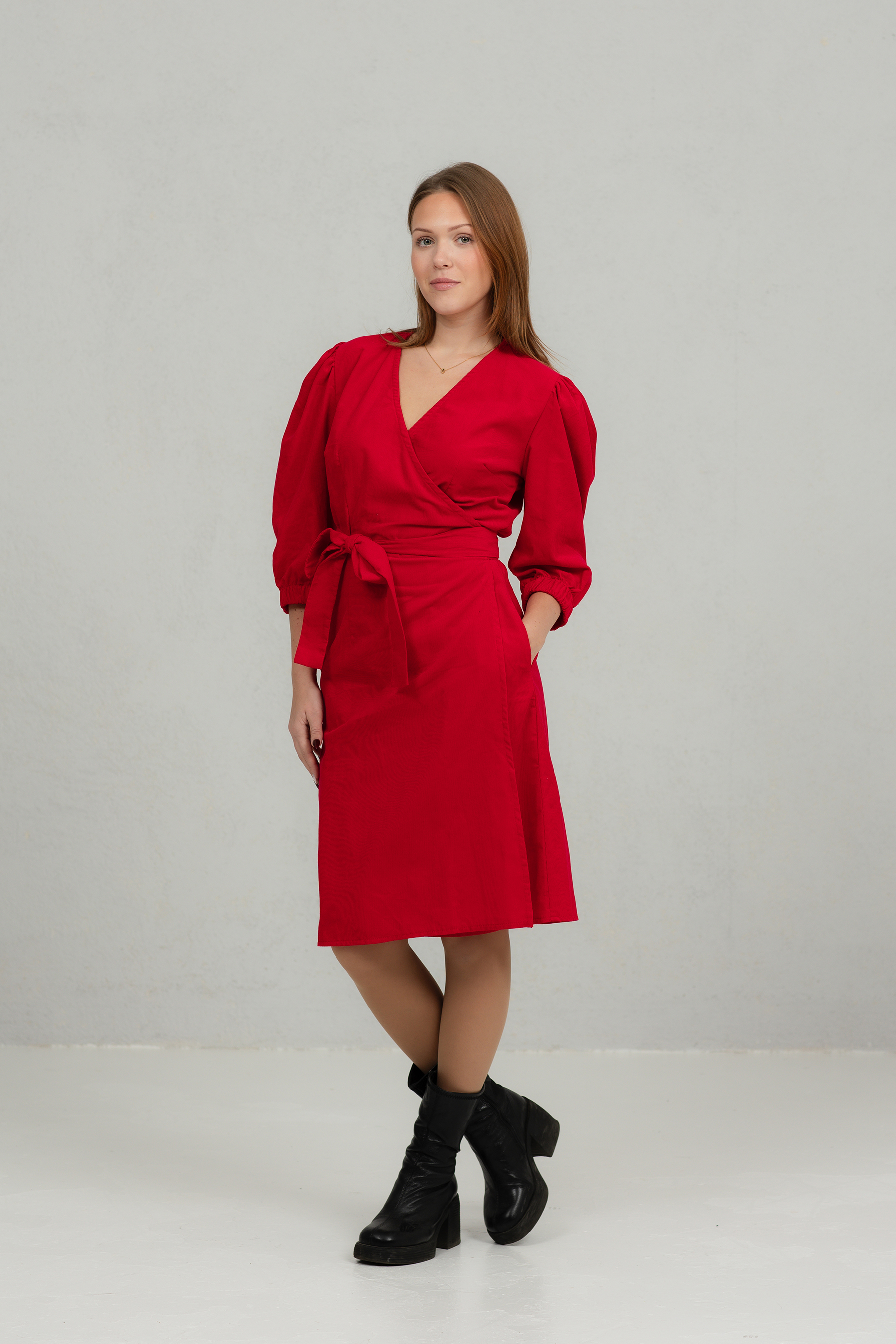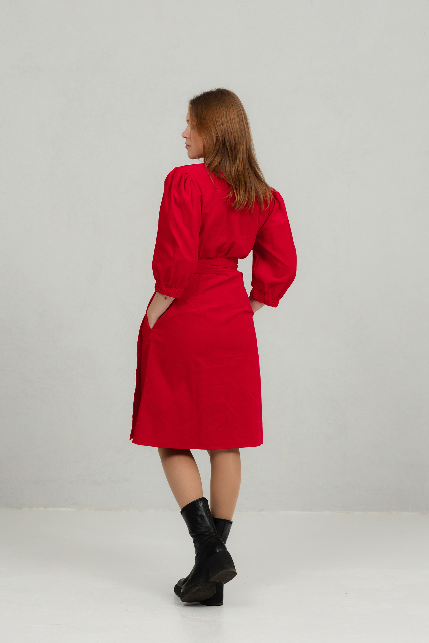 Klassikalise lõikega õhukesest peenetriibulisest velvetkangast hõlmikkleit. Kleit on vööga kinniseotav, nööpideta. Kleidil on 2/3 pikkuses puhvis varrukad ja kaks mugavat küljetaskut.