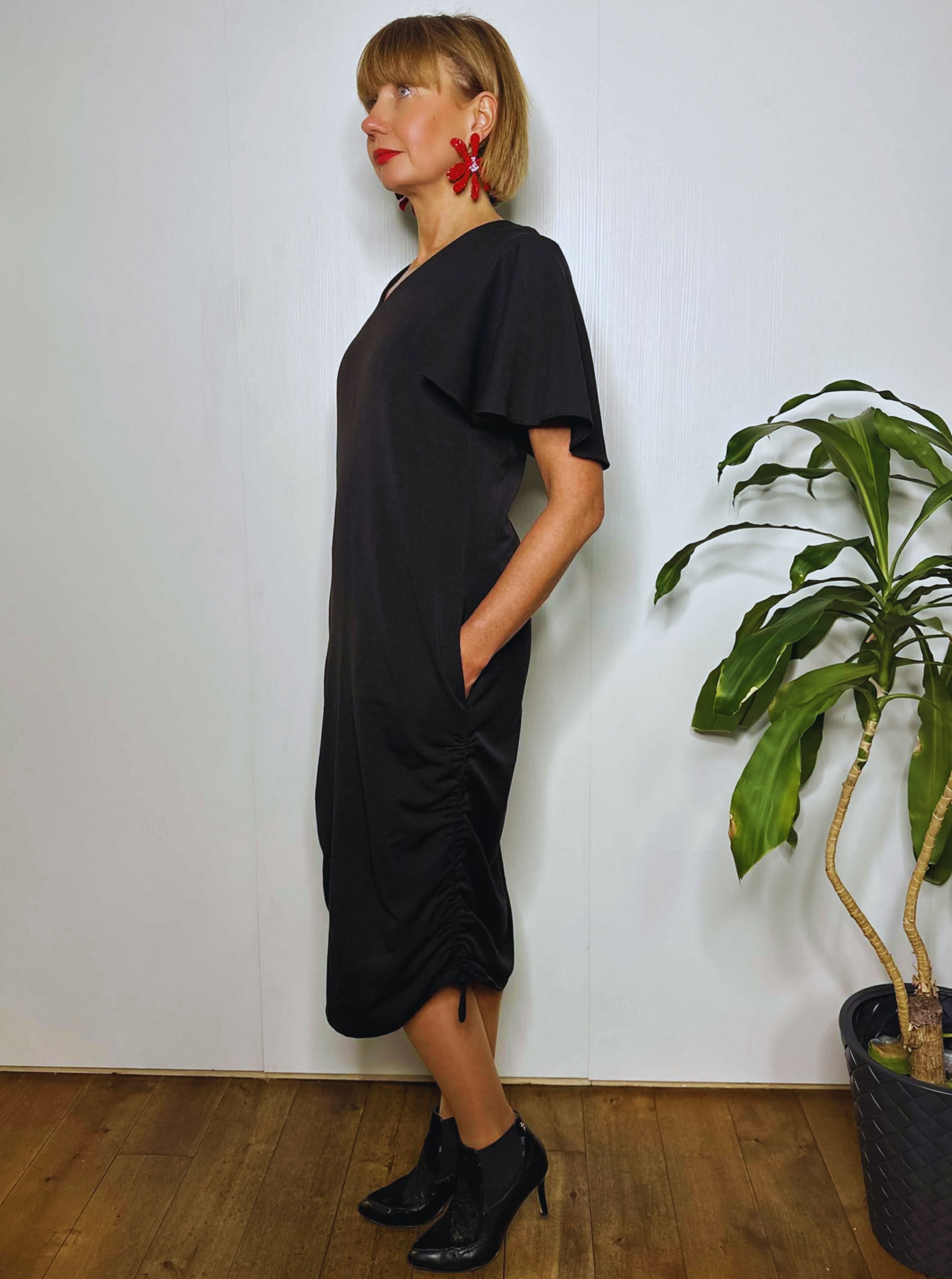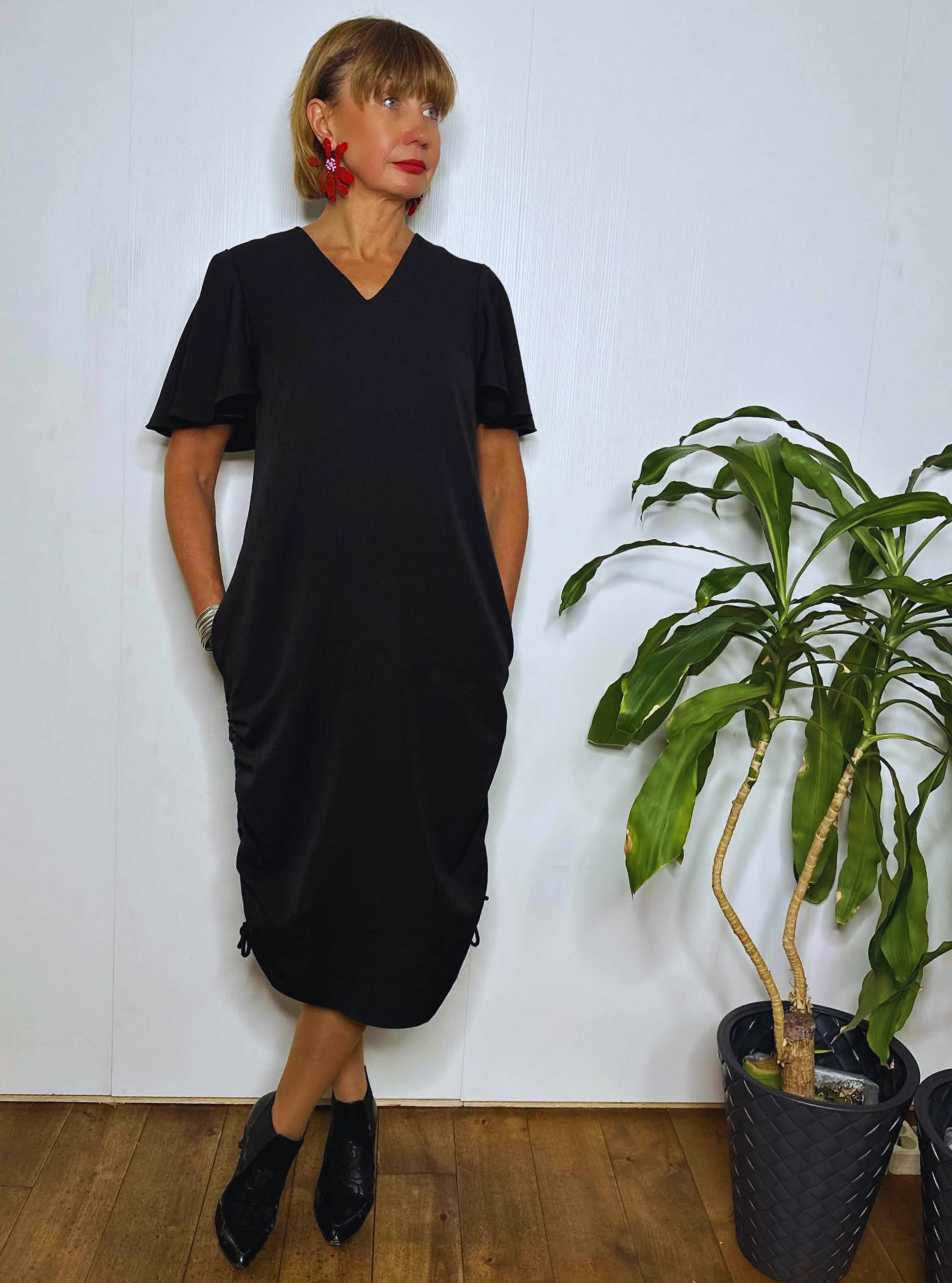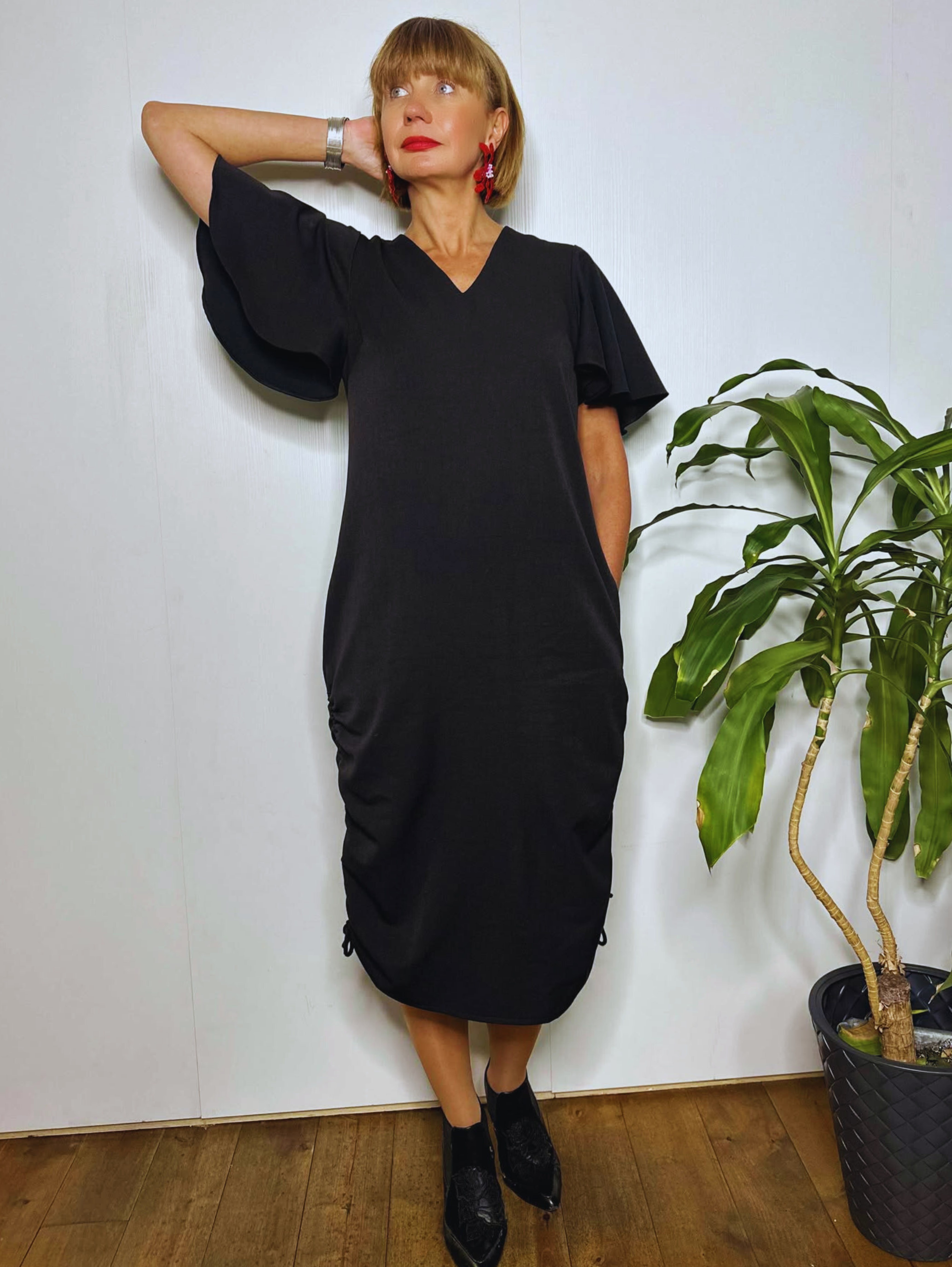 Pehmest segukangast midipikkuses kleit, mille külgedel asuvate paeltega saab reguleerida kleidi pikkust ja krookeid. Naiselikkust lisavad lendlevad varrukad. Kleidil on kaks mugavat küljetaskut.