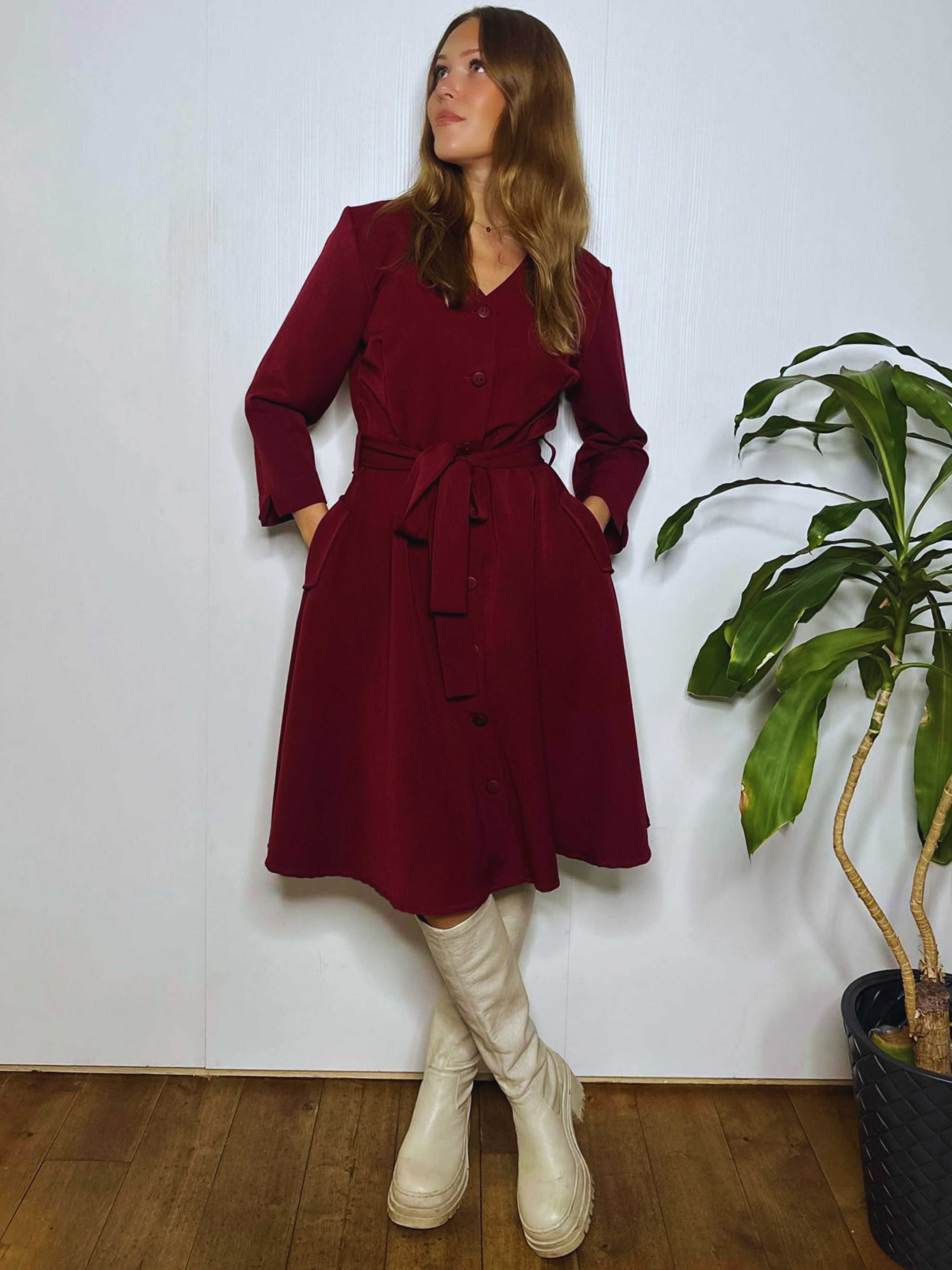 Laia seelikuosaga ja 3/4 pikkuste sirgete varrukatega kleit mõnusast pehmest kangast. Kleidil on kaks mugavat küljetaskut ning hõlmad on eest lõpuni lahtinööbitavad.