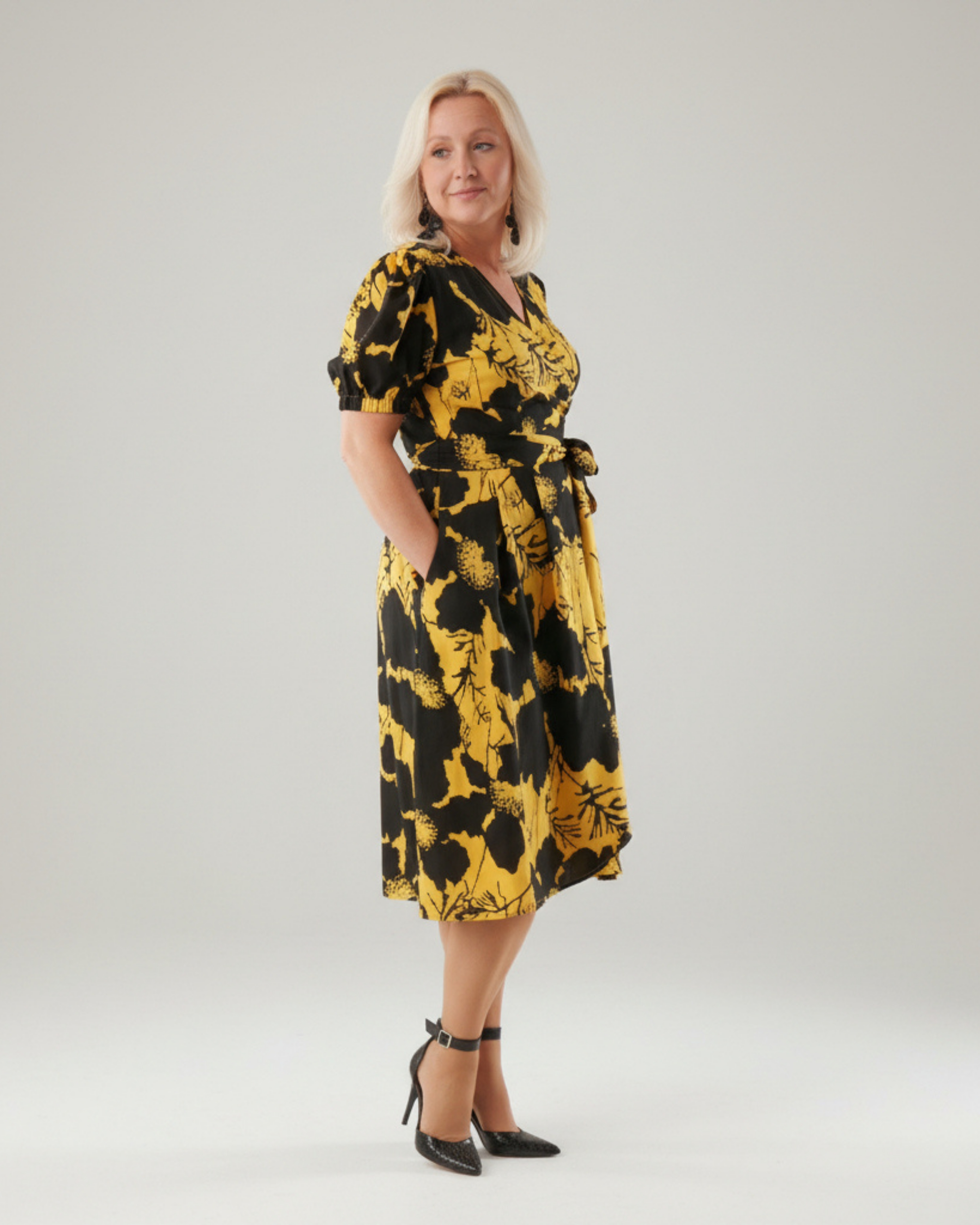 Midipikkuses hõlmikkleit “Kai”, lühikeste puhvis varrukatega, kollane suurte lilledega