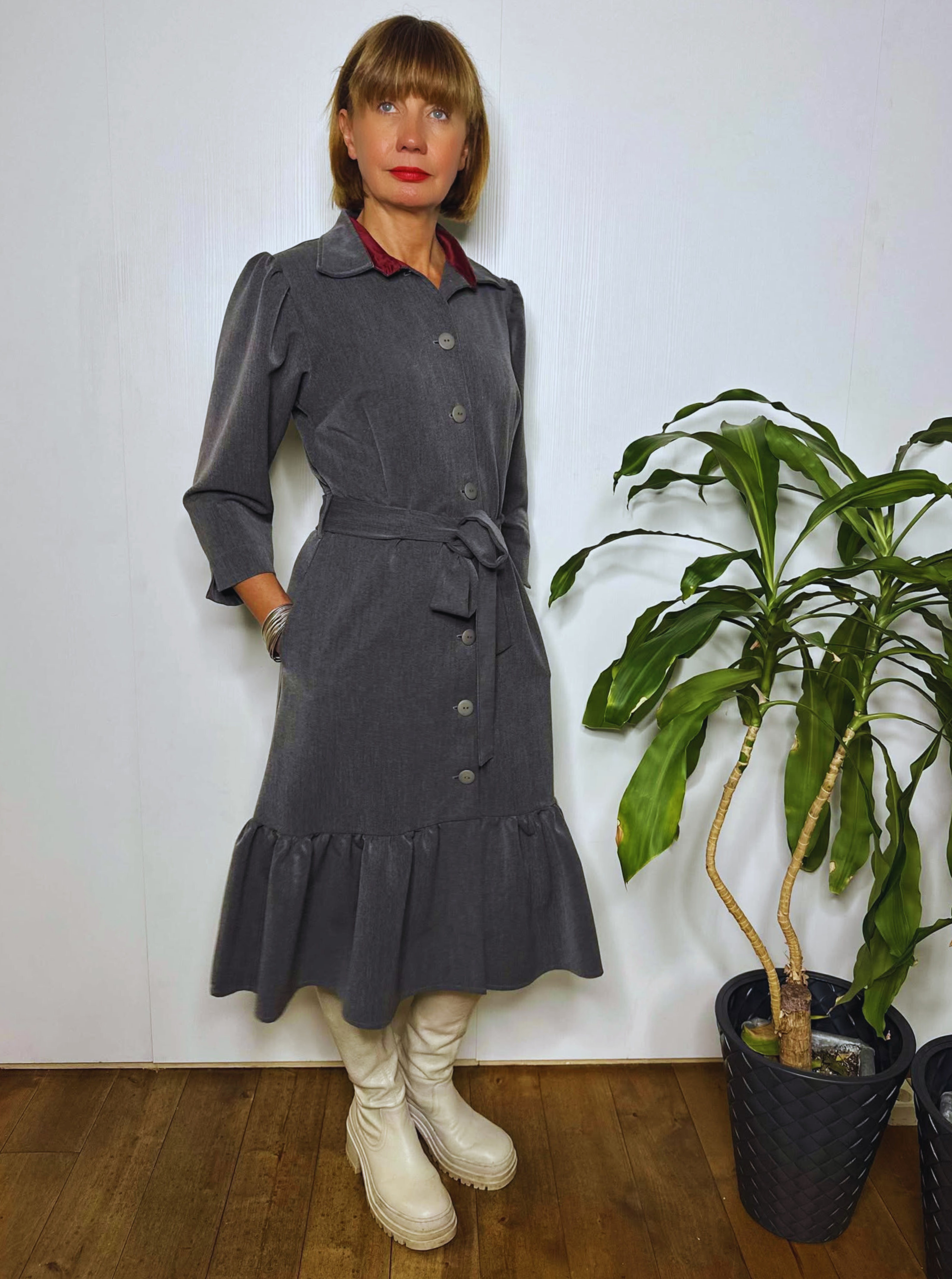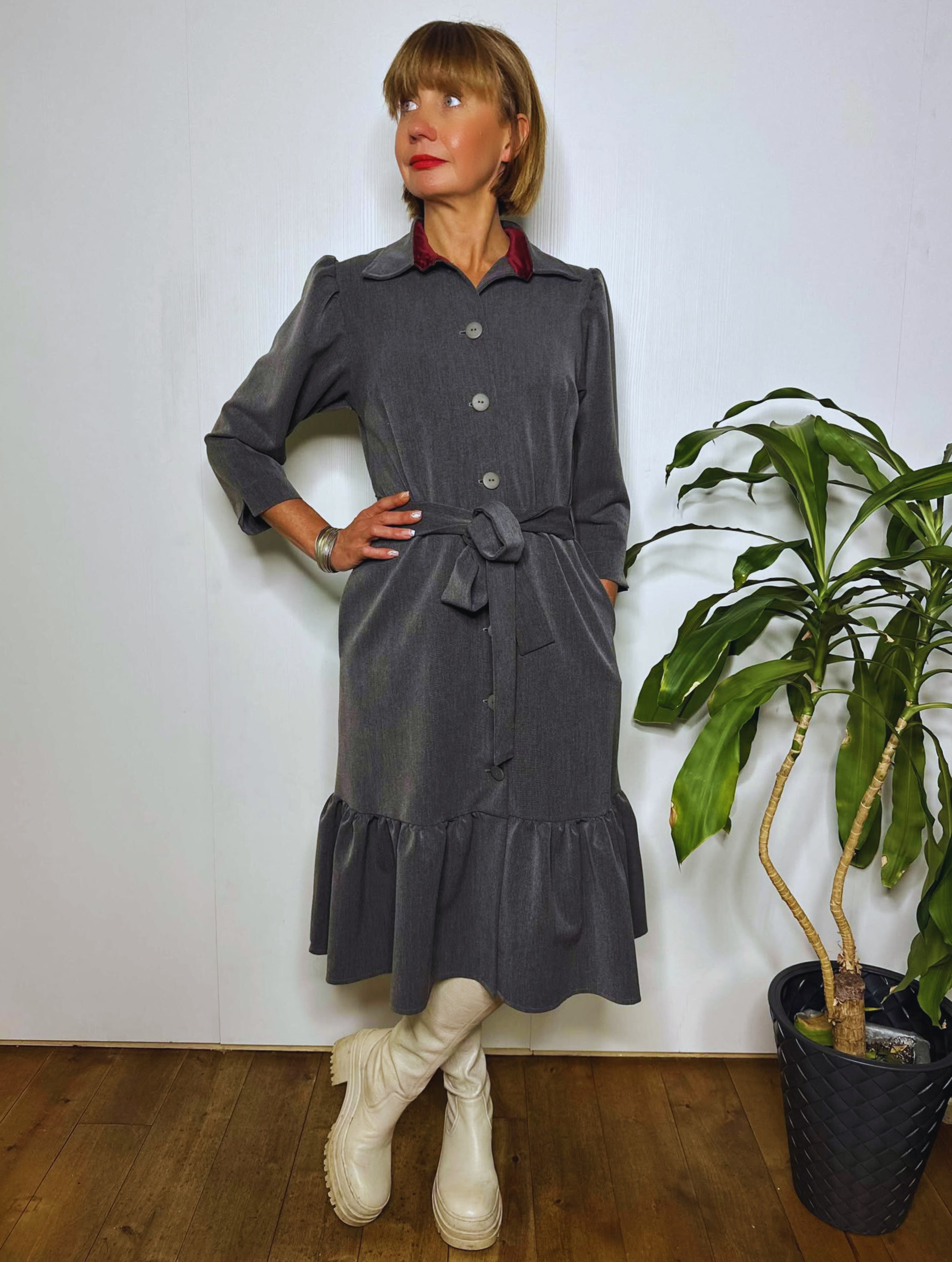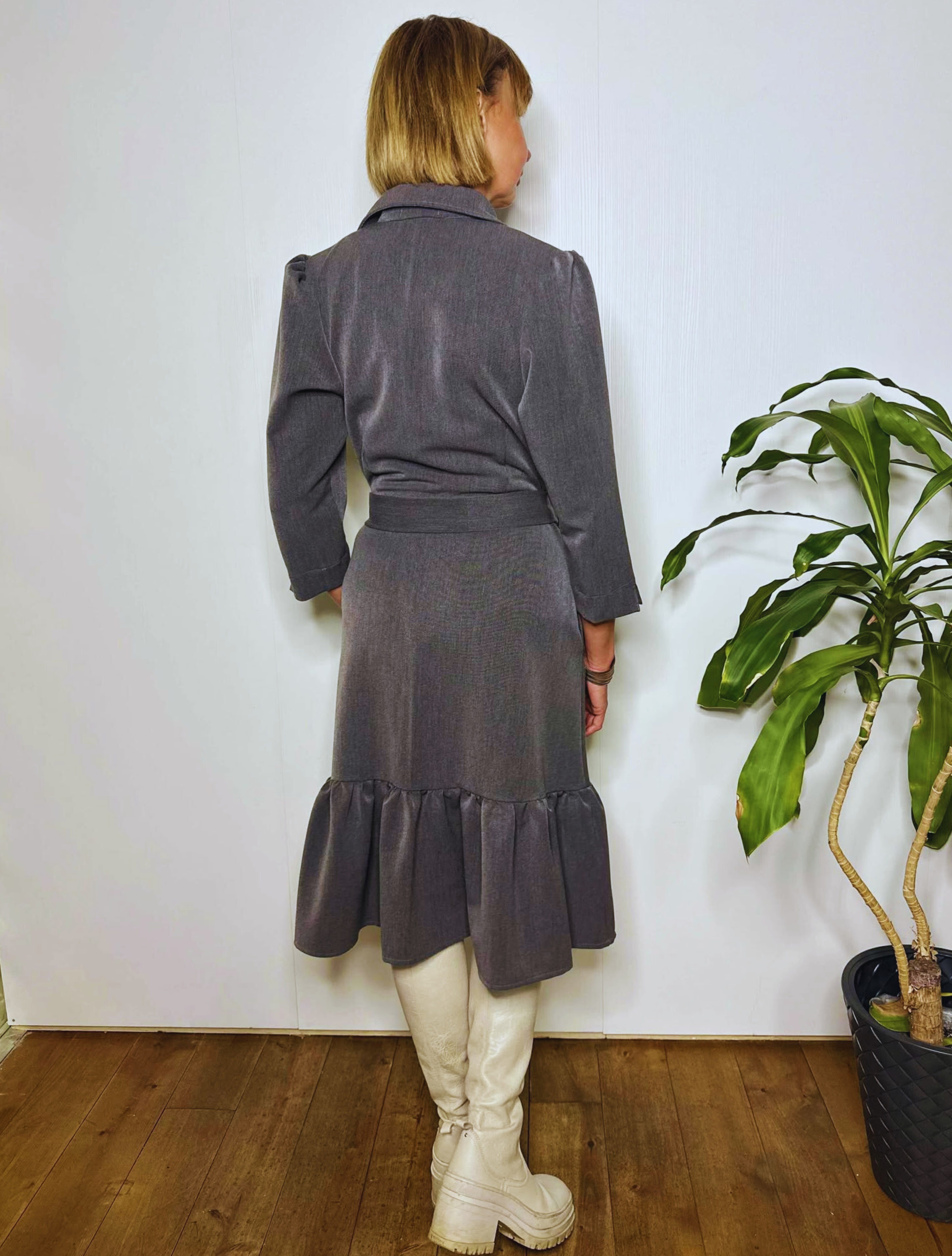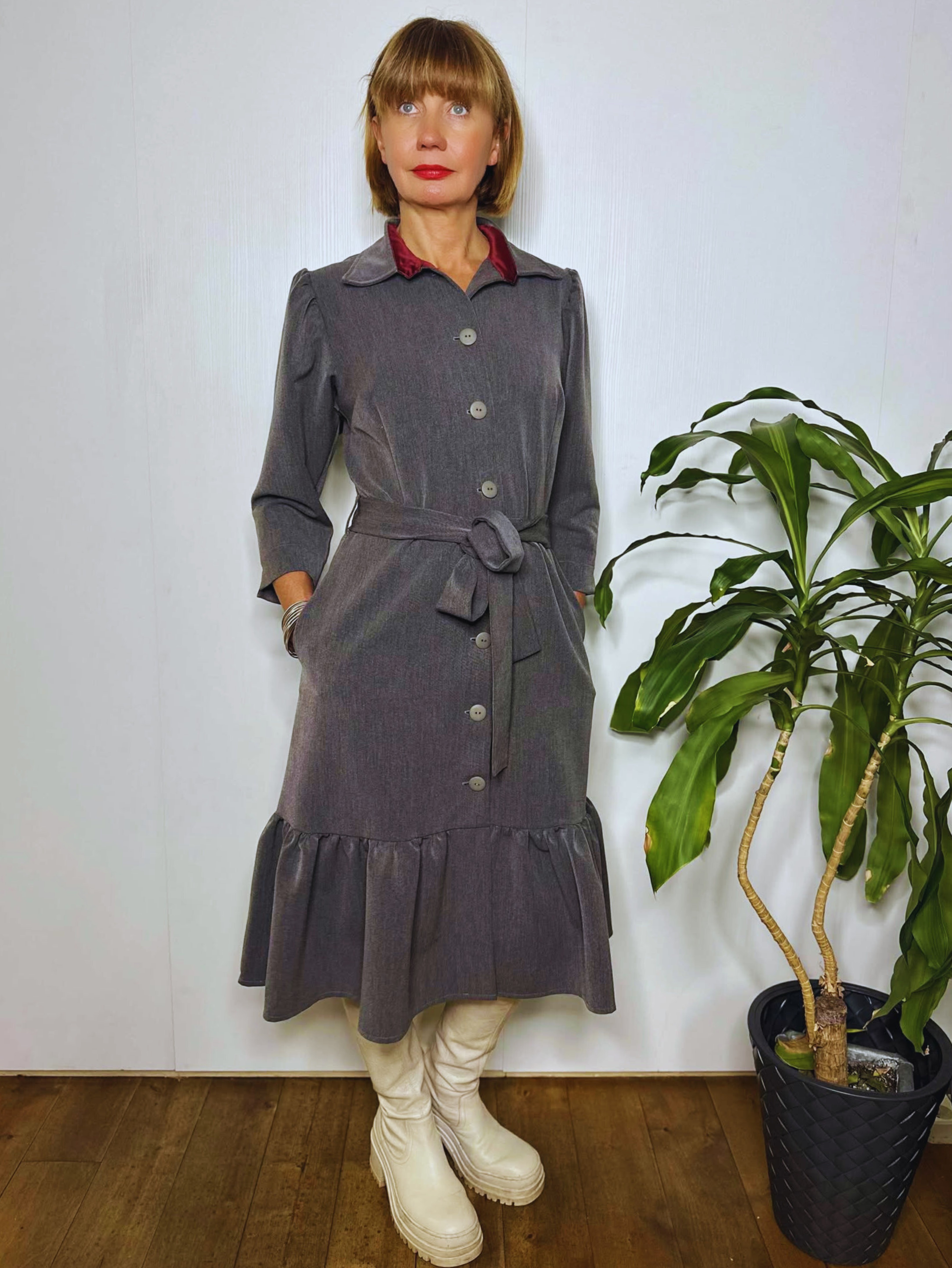Midipikkuses volangiga kleit mõnusast pehmest kangast, millele lisab erilisust krae ja nööbiliistu siseküljel olev kontrastset värvi satiinvooder. Kleidil on kaks mugavat küljetaskut ning hõlmad on eest lõpuni lahtinööbitavad.