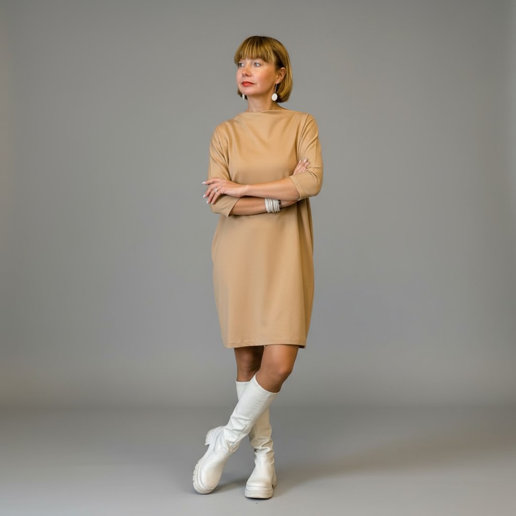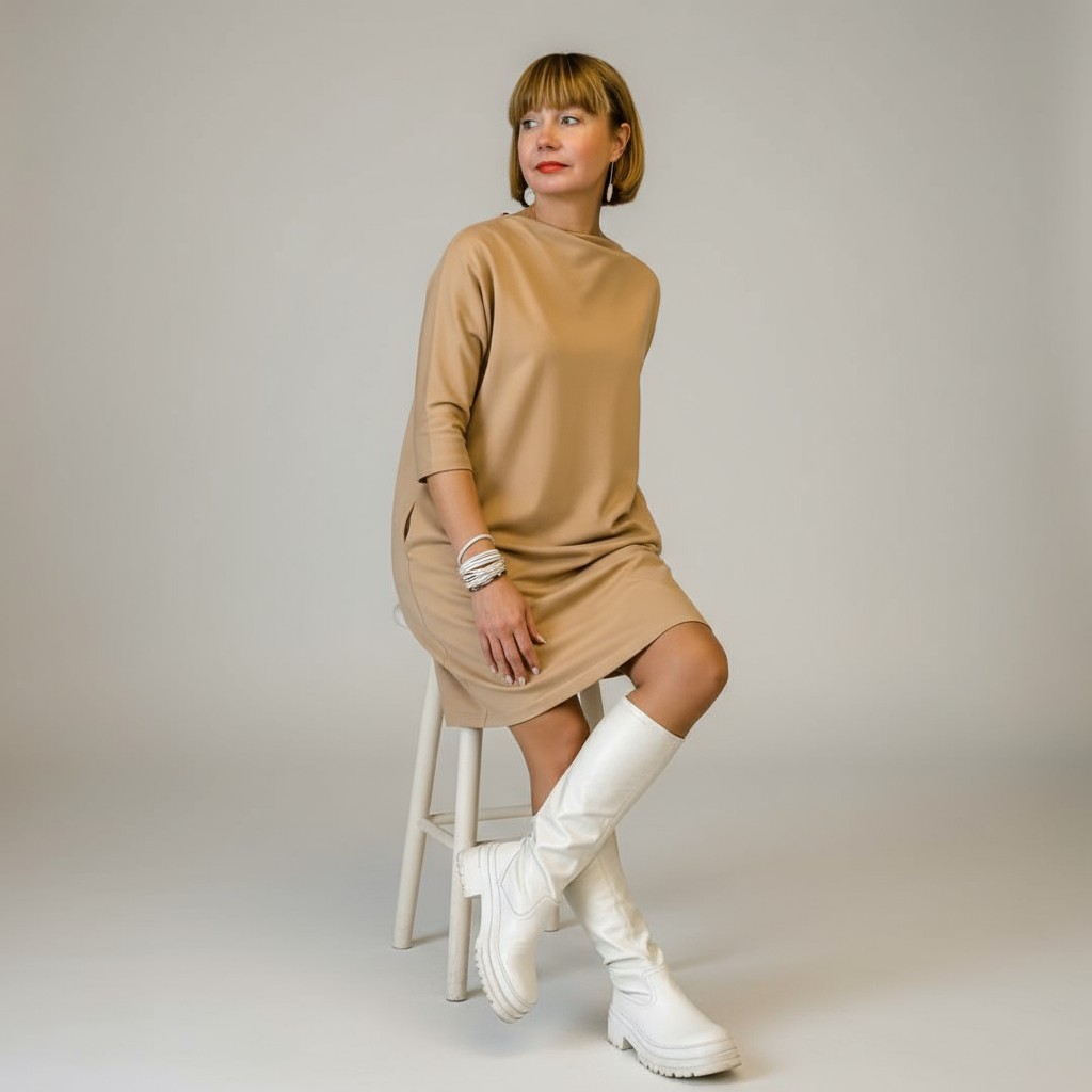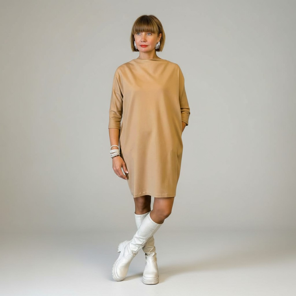 Nahkhiirevarrukatega mõnusast paksemast trikotaažist kleit. Kleidil on kaks mugavat küljetaskut.