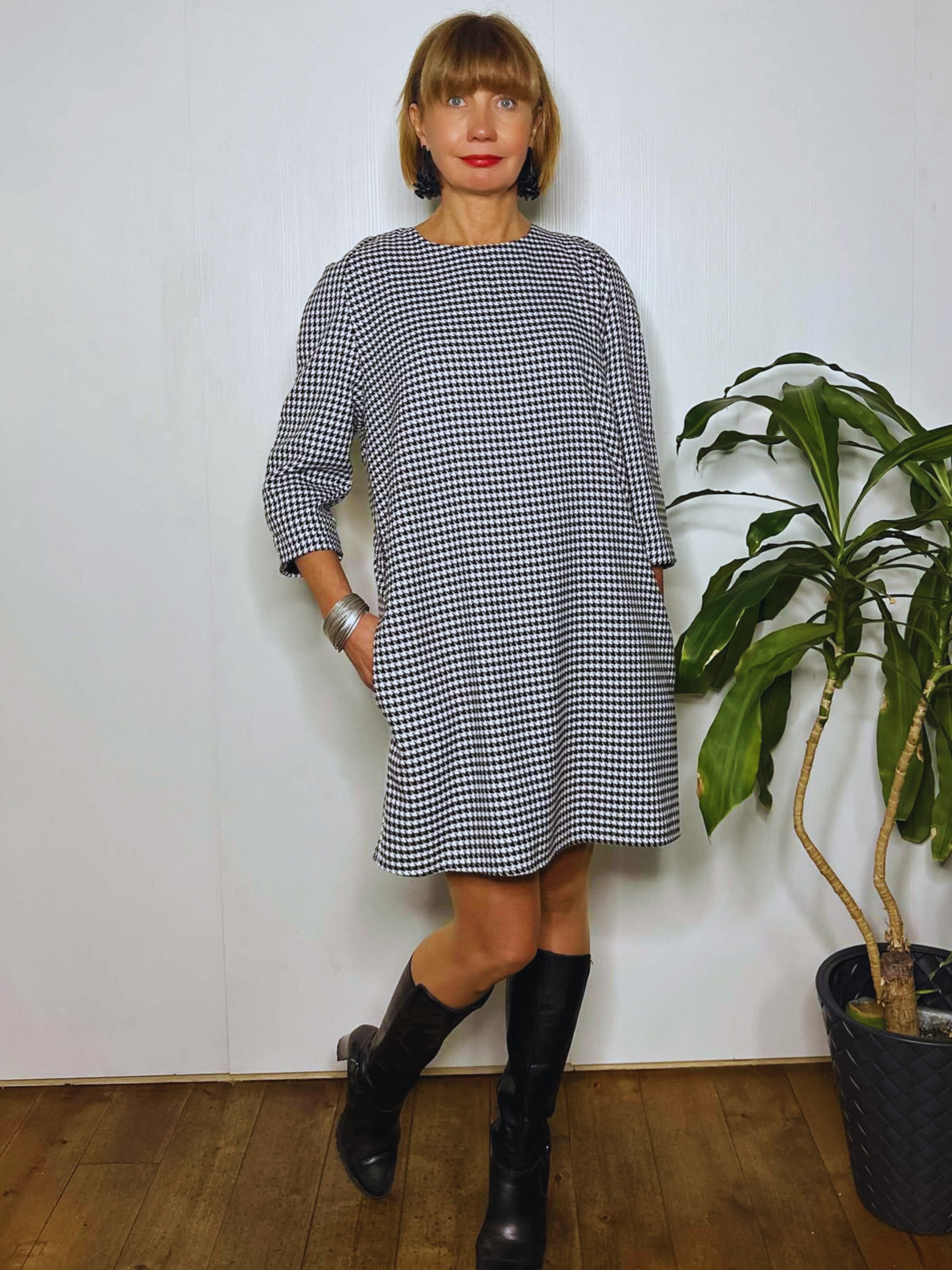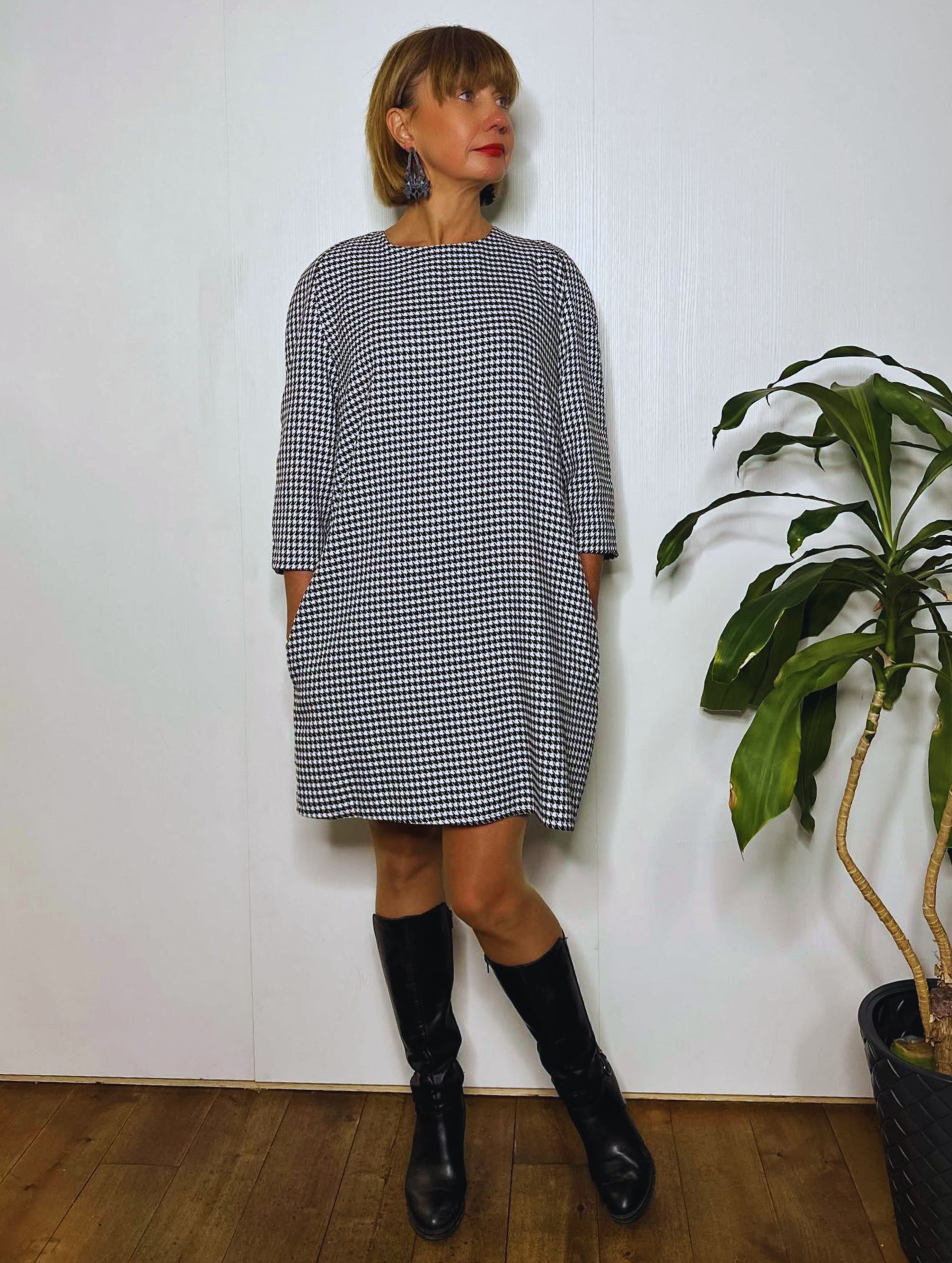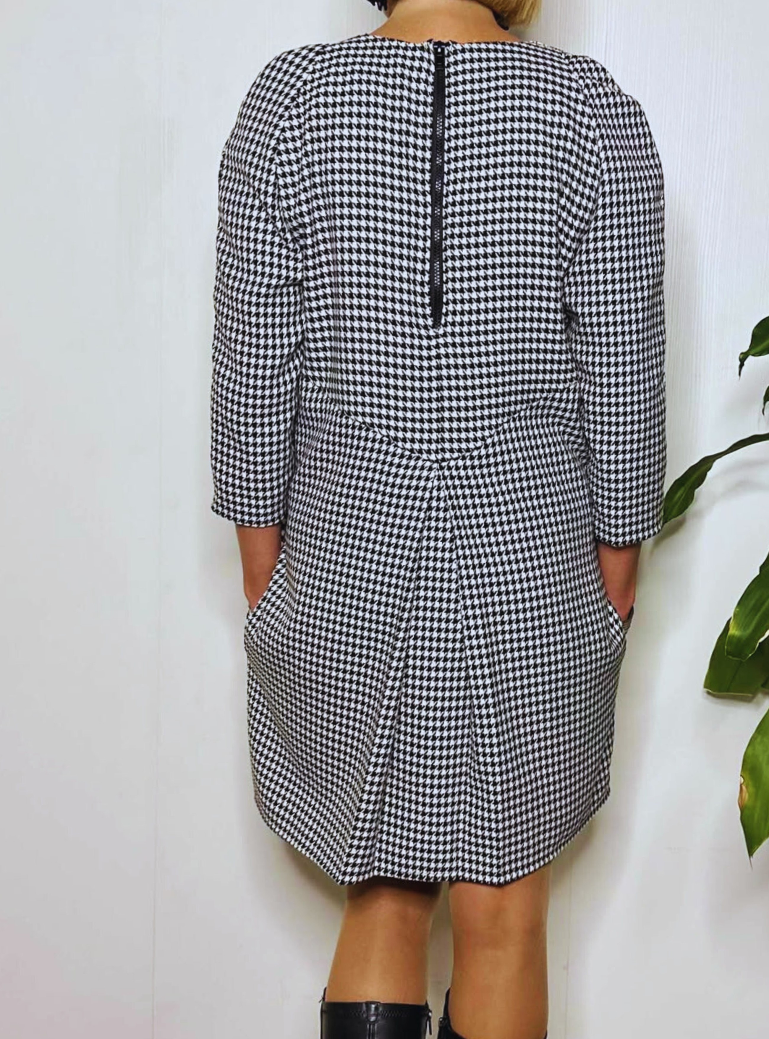 Avara lõikega mõnusast paksemast kangast kleit, millele lisavad erilisust tagaküljel asuv volt ja efektne lukk. Kleidil on vooder ning kaks mugavat küljetaskut.