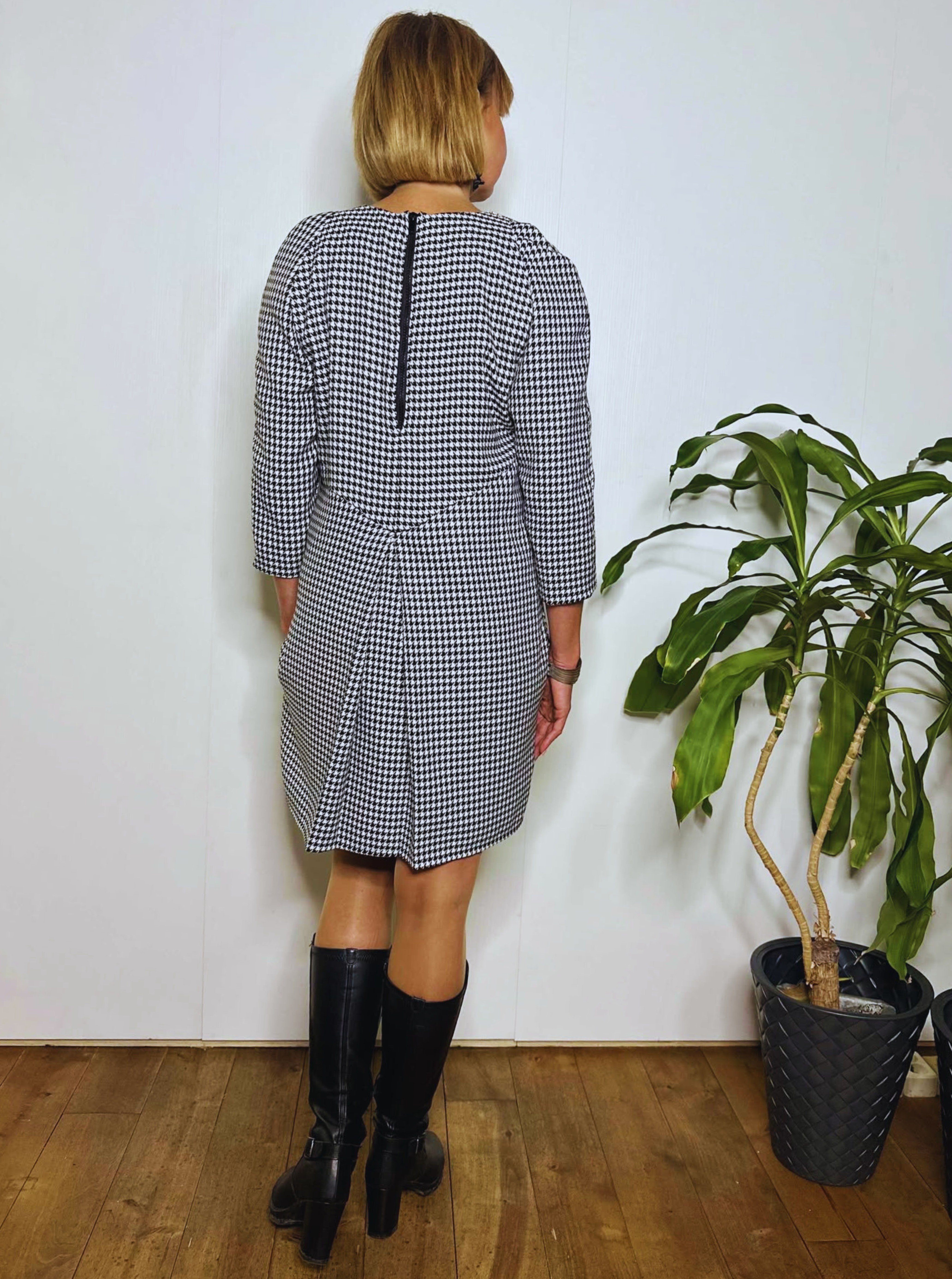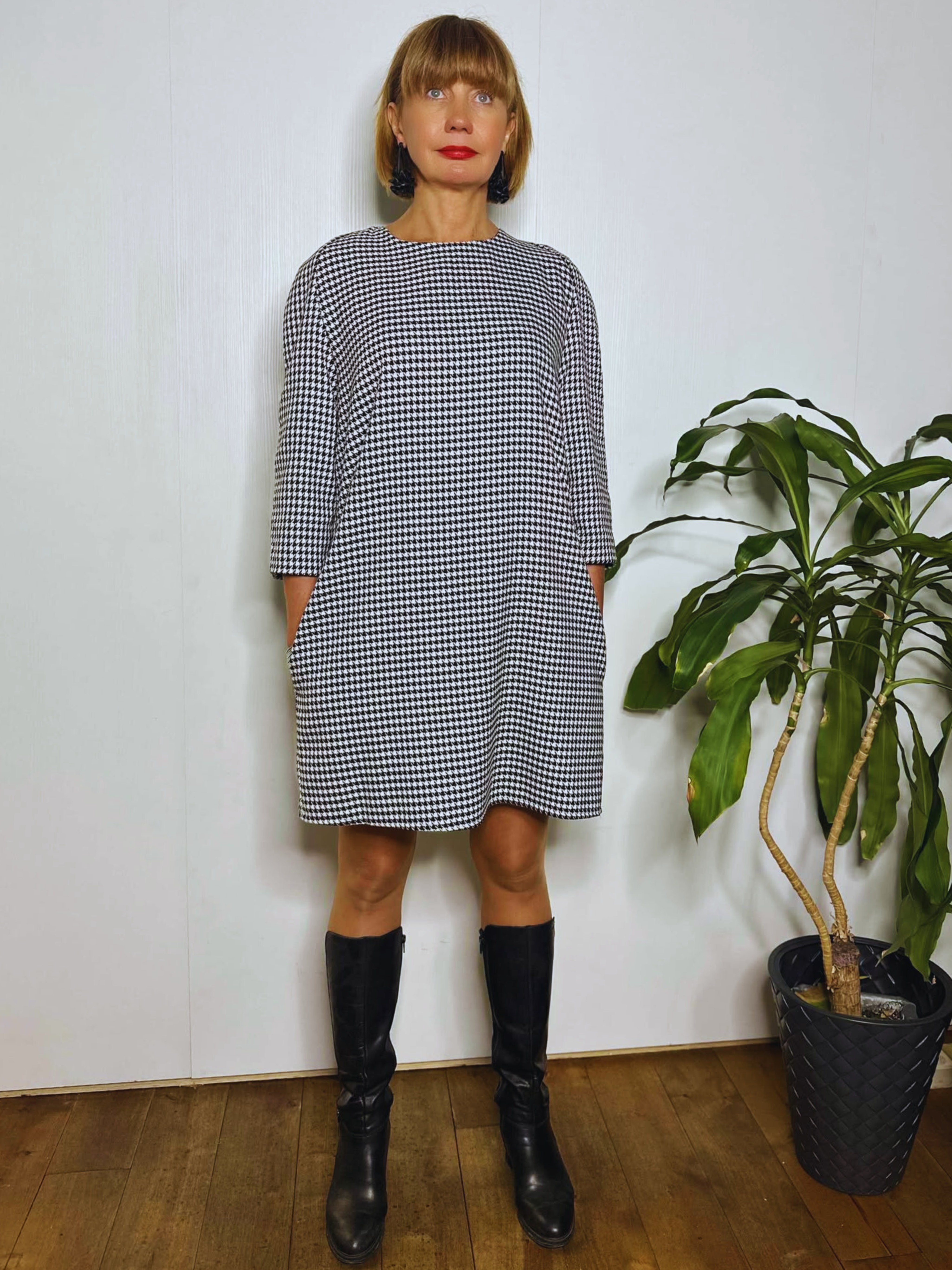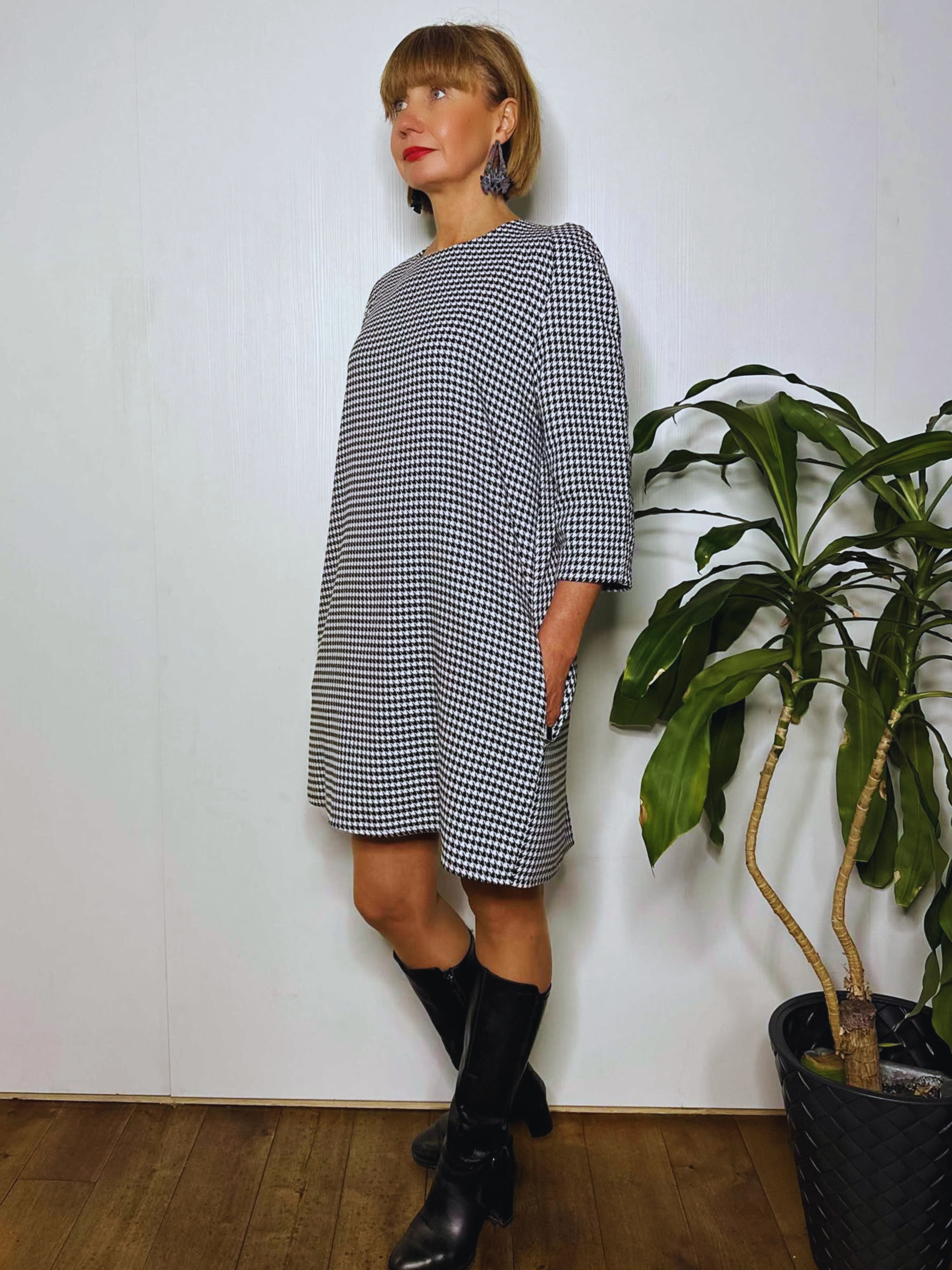 Avara lõikega mõnusast paksemast kangast kleit, millele lisavad erilisust tagaküljel asuv volt ja efektne lukk. Kleidil on vooder ning kaks mugavat küljetaskut.