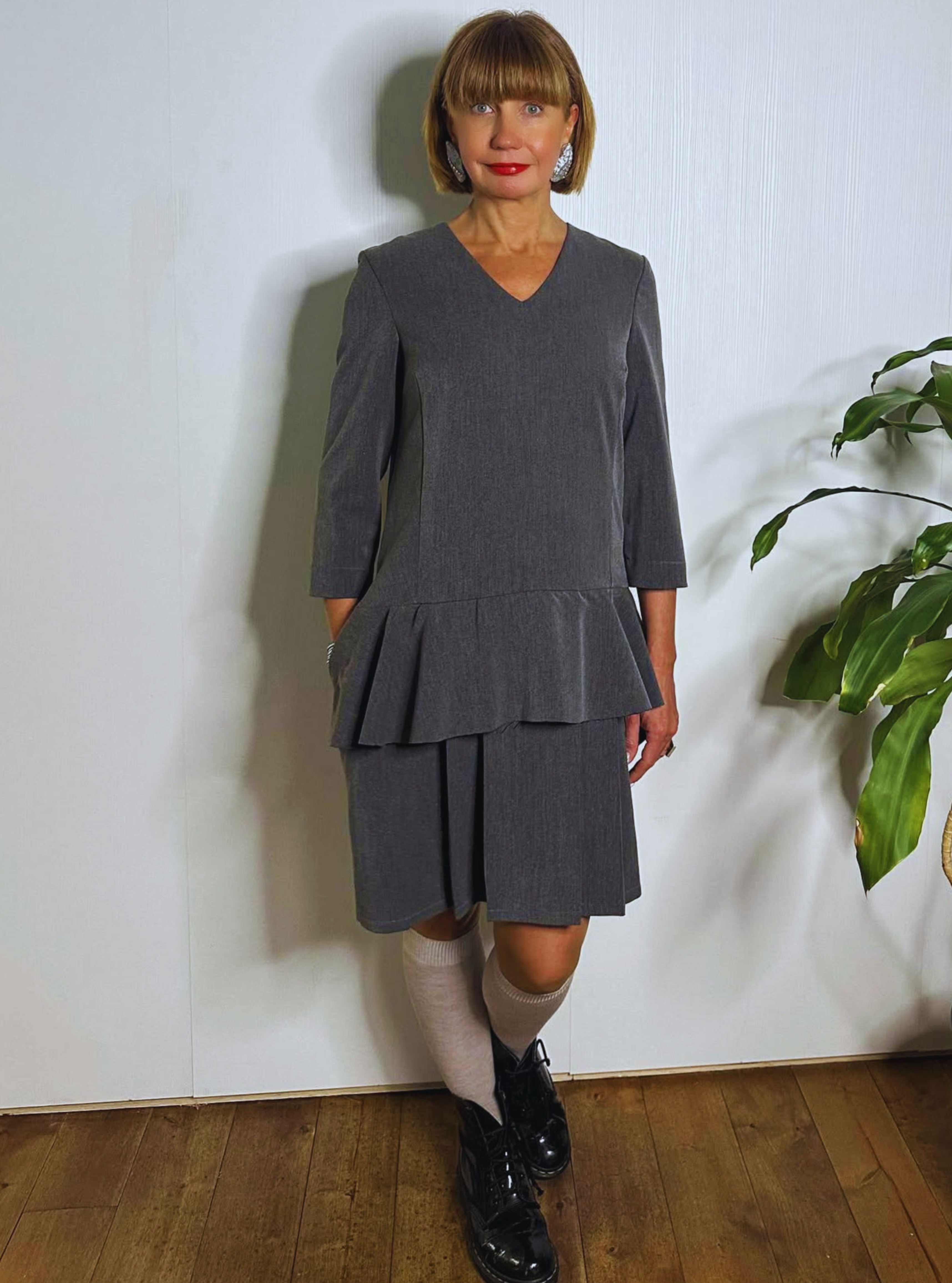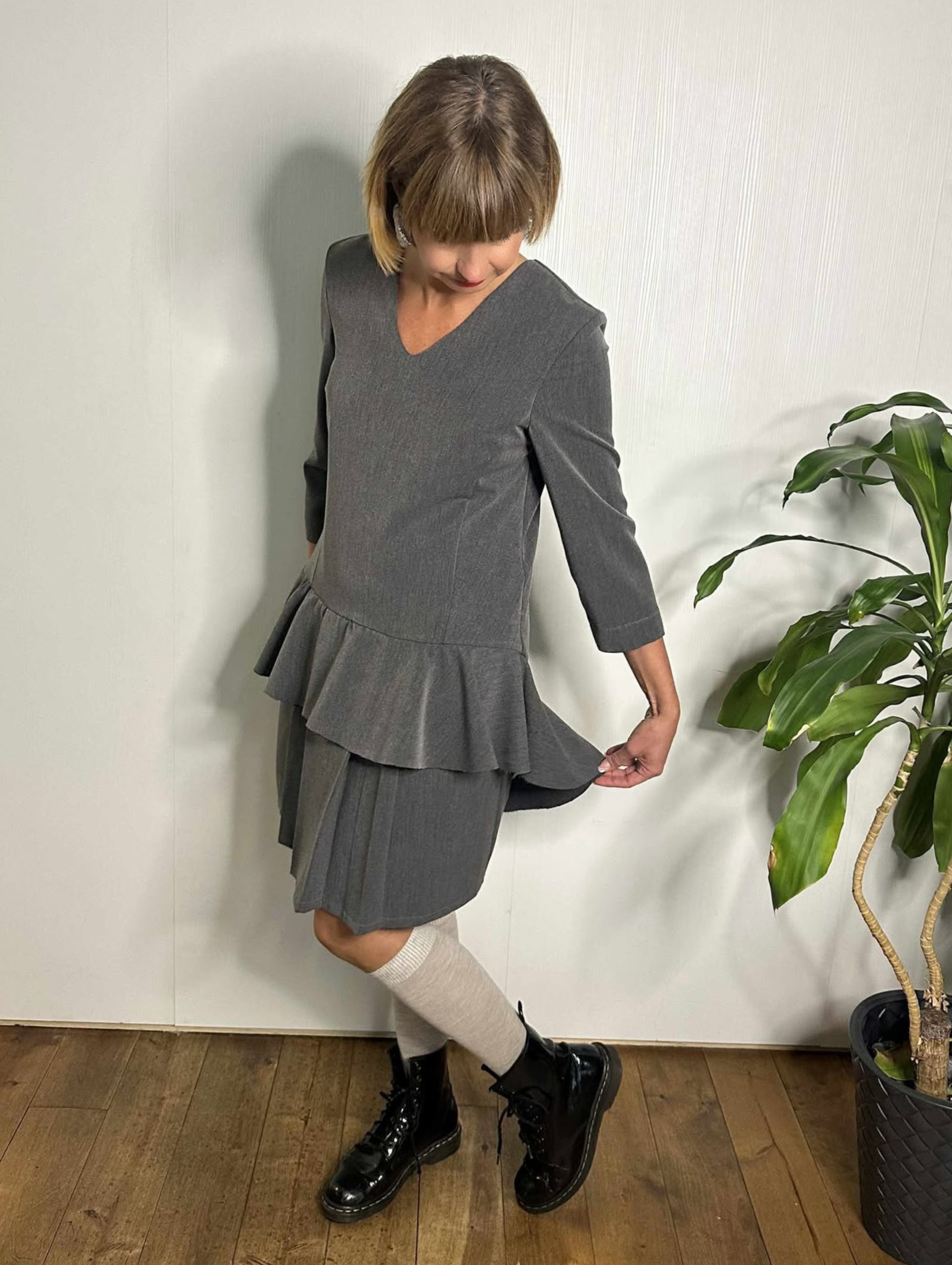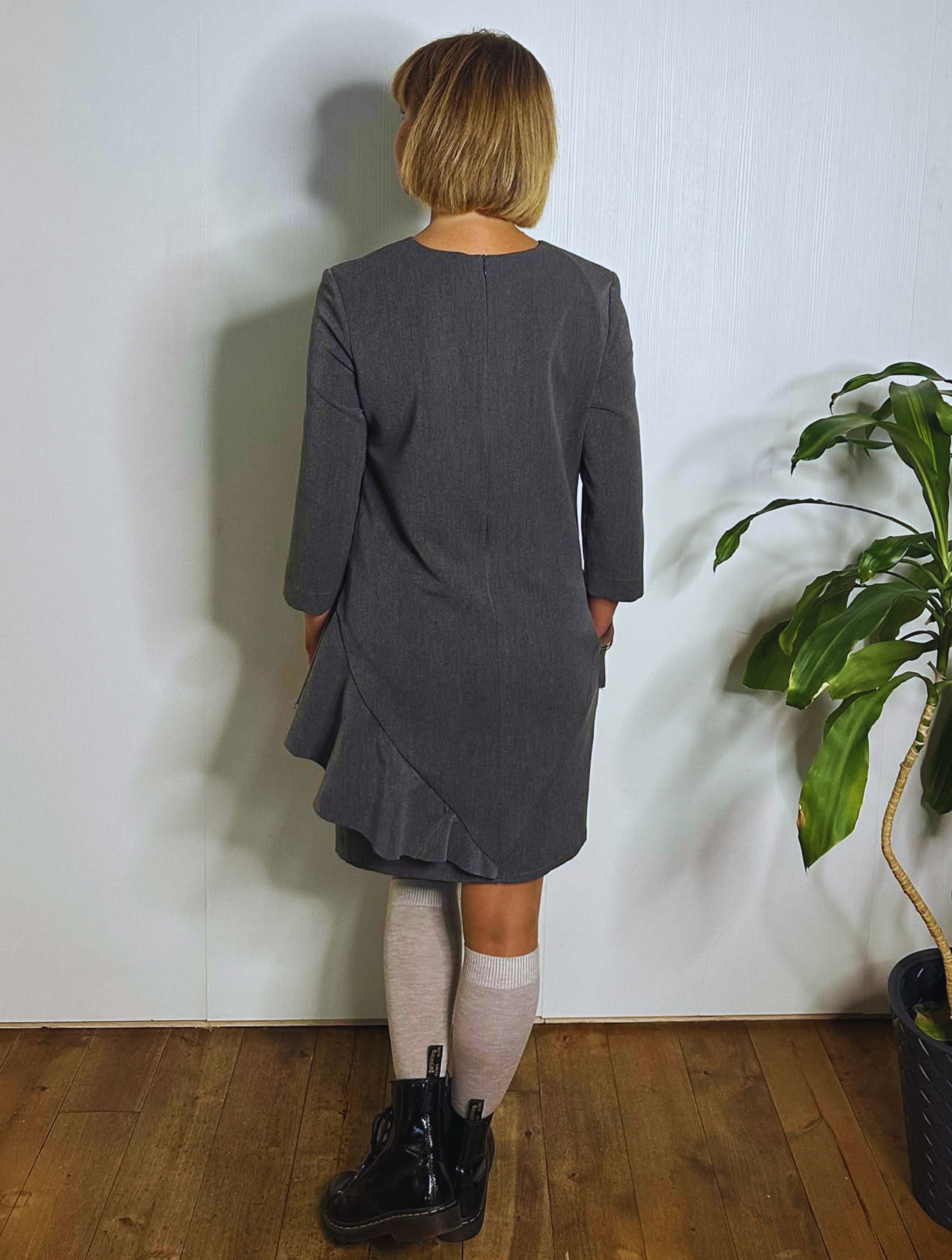 Mõnusast pehmest kangast tagant lukuga kleit, mille muudavad eriliseks nii ees- kui ka osaliselt tagaküljel asetsev volang ning esikülje seelikuosal paiknevad plisseeritud voldid. Kleidil on vooder.