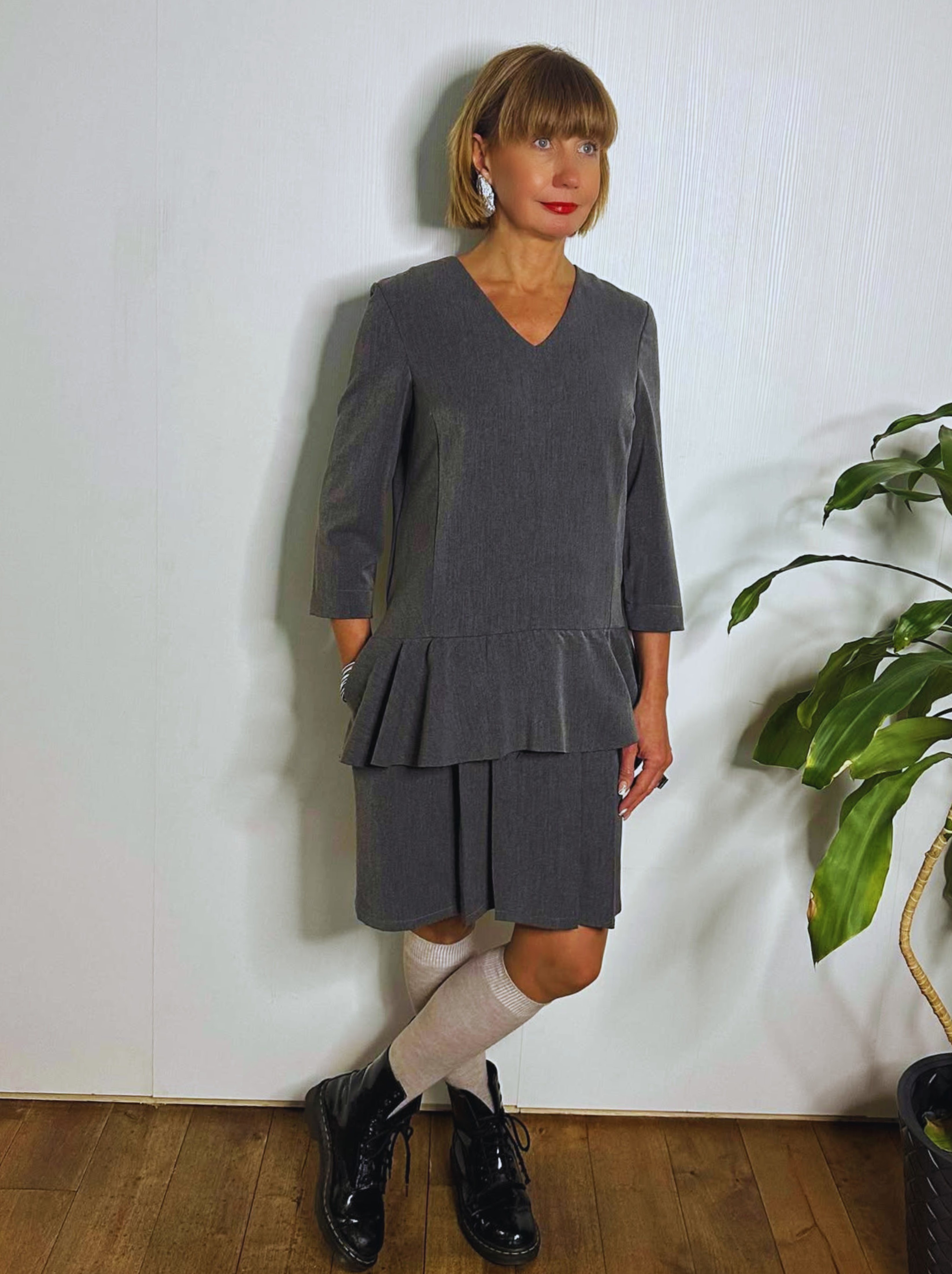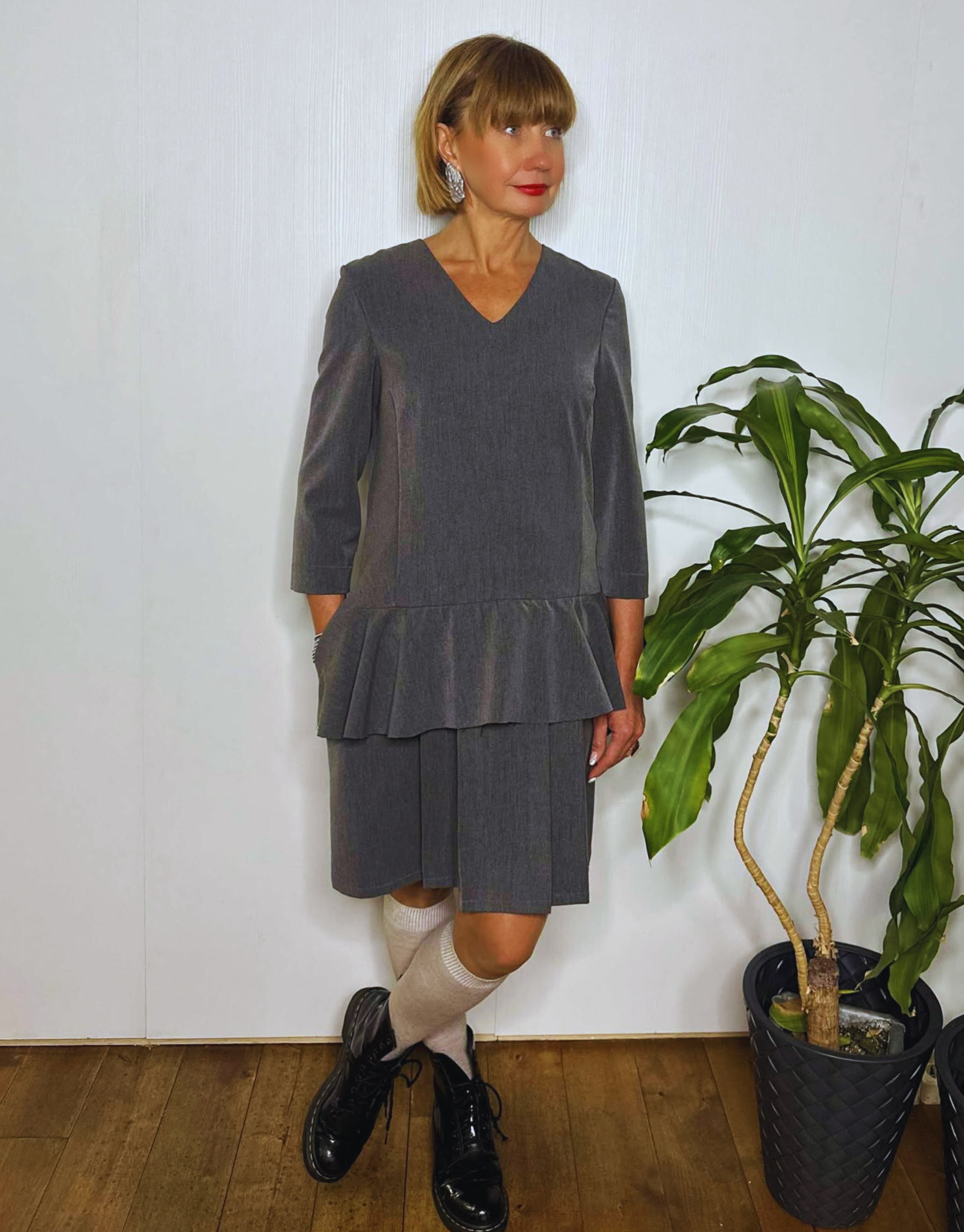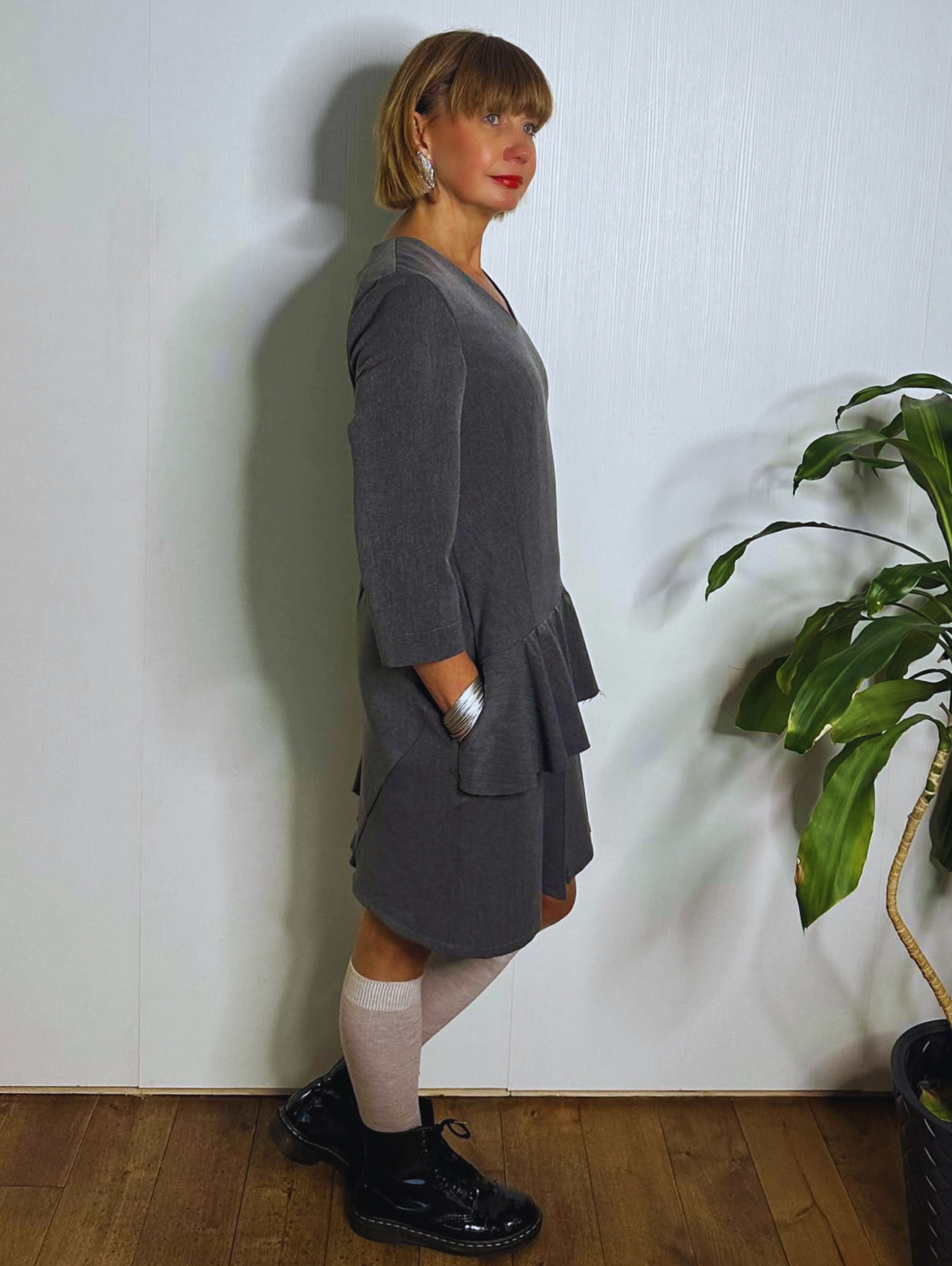 Mõnusast pehmest kangast tagant lukuga kleit, mille muudavad eriliseks nii ees- kui ka osaliselt tagaküljel asetsev volang ning esikülje seelikuosal paiknevad plisseeritud voldid. Kleidil on vooder.